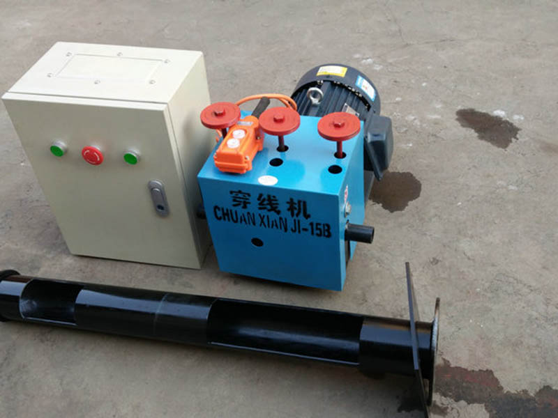 電機帶動主動輪轉動,鋼絞線從一端進線口插入,壓輪壓住鋼絞線向前移動沿導管穿入預留孔道,直到從孔道另一端穿出,達到張拉用尺寸。